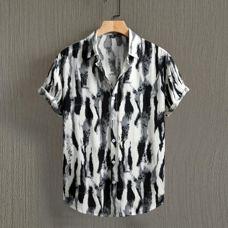 Men Ink Wash Abstract Print Turn Down Collar Short Sleeve Casual Button Up Shirt